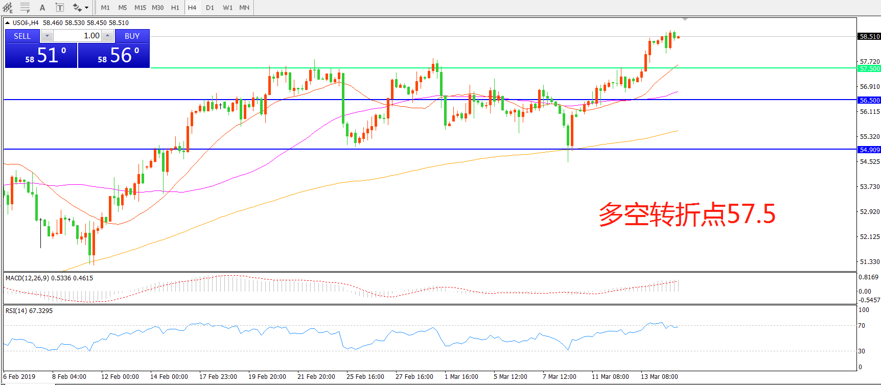 4小时图看,油价整体维持高位震荡走势,强势突破前期阻力57.5阻力后并未出现大幅波动,短期走势偏强,均线系统呈多头排列,MACD红柱增加,RSI指标走平,震荡上行概率较大