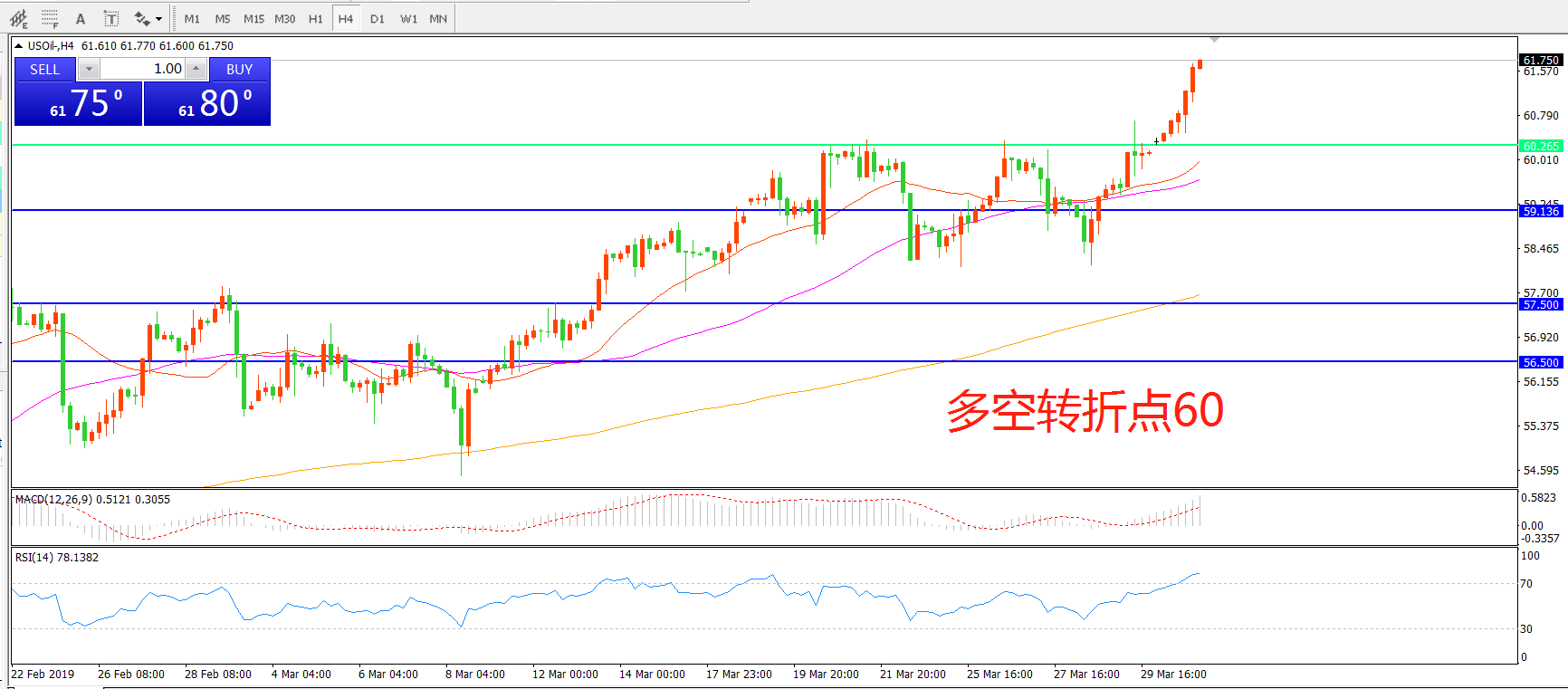 4小时图看,油价以均线系统为依托逐步企稳,强势突破前高60美金后连续拉升,短期走势偏强。均线系统呈多头排列,MACD红柱增加,RSI指标向上,62.5美金阻力咫尺之间,一旦突破将开启新一轮的上涨趋势。