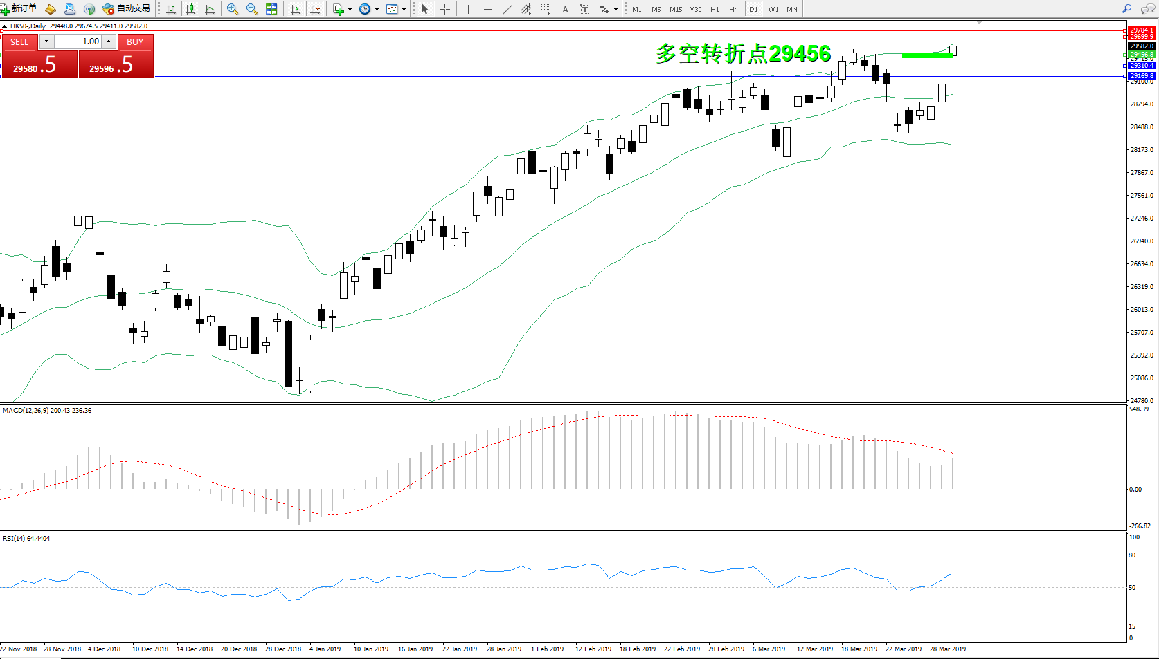 得益于中国制造业活动回升,亚洲股市全线大涨,其中中国内地股市领涨亚太市场,深成指升破10000点,创2018年6月以来新高,香港恒生指数高开后维持高位窄幅震荡,截至收盘,恒指涨1.73%,报29,554.74点。3月财新中国制造业PMI录得50.8,高于预期的49.9。同时,据中国国家统计局周日公布的数据,中国官方3月制造业PMI由2月的三年低点49.2升至50.5,四个月来首次重返枯荣线上方。该指数的读数在50.0荣枯线之上表示行业扩张,低于该数值则表示收缩。同时,中国下调增值税税率,其中制造业等行业原有16%增值税率降为13%,交通运输、建筑、房地产等行业现行10%税率降为9%。