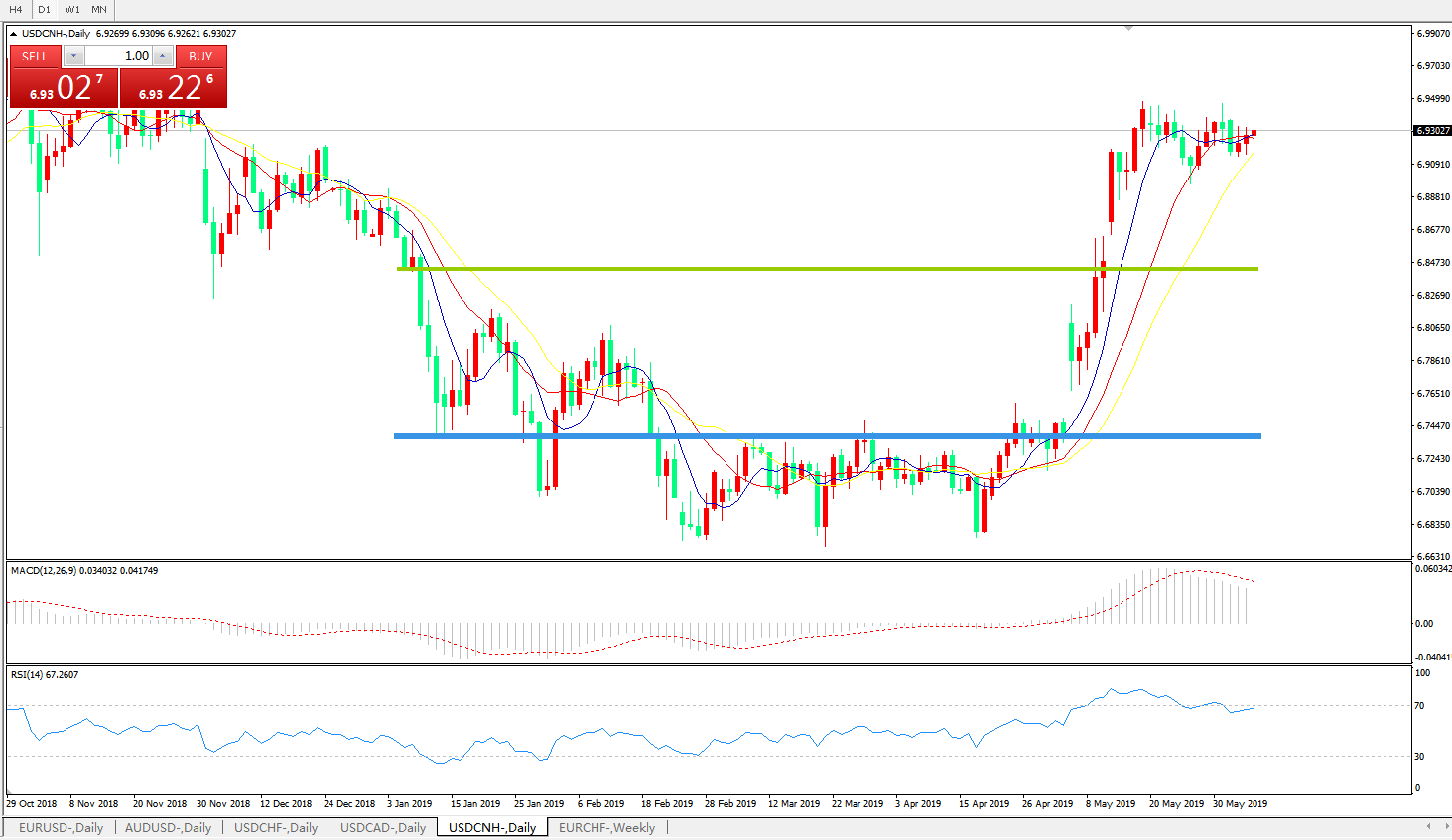 技术面简析:日线图均线整体维持攻势,MACD0轴上方运行但动能柱轻微缩量,RSI超买区域附近运行,汇价强力上攻后宽幅强势整理,预计短期汇价有下行回踩需求,中期重点关注中美贸易争端后续进展。