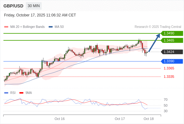 在 1.3390 之上,看涨,目标价位为 1.3465 ,然后为 1.3490 。