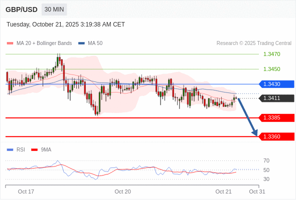 在 1.3430 之下,看跌,目标价位为 1.3385 ,然后为 1.3360 。