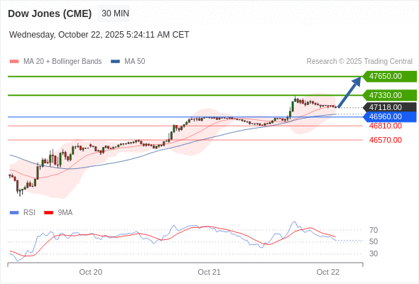 美国道琼斯指数期货 (Z5) 当日内: 在46960.00之上,看涨。