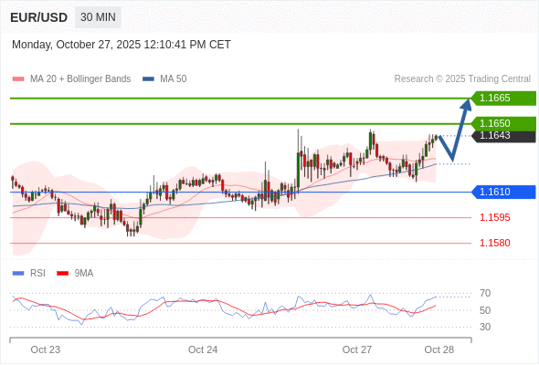 在 1.1610 之上,看涨,目标价位为 1.1650 ,然后为 1.1665 。