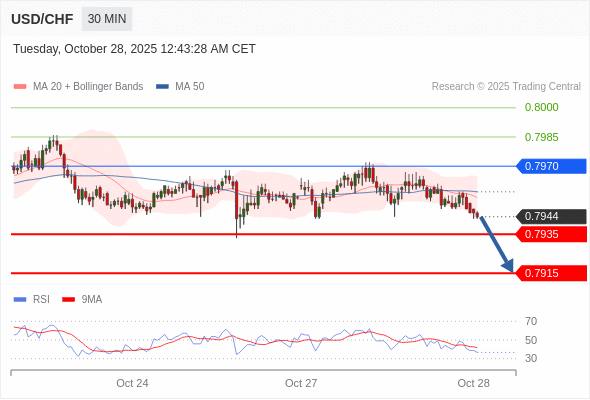 在 0.7970 之下,看跌,目标价位为 0.7935 ,然后为 0.7915 。