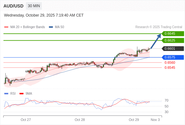 在 0.6575 之上,看涨,目标价位为 0.6625 ,然后为 0.6645 。