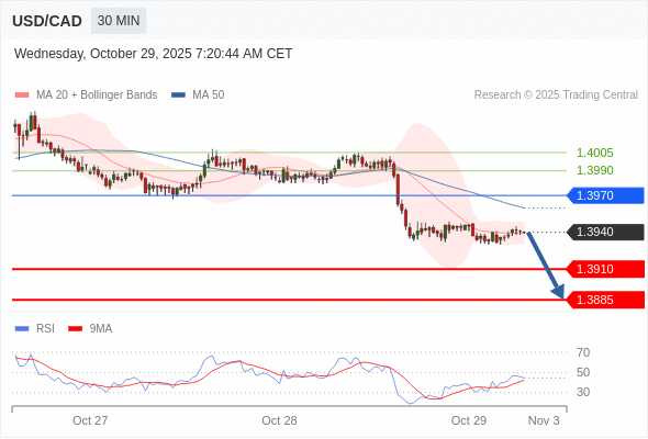 在 1.3970 之下,看跌,目标价位为 1.3910 ,然后为 1.3885 。