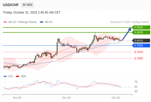 在 0.7995 之上,看涨,目标价位为 0.8035 ,然后为 0.8050 。