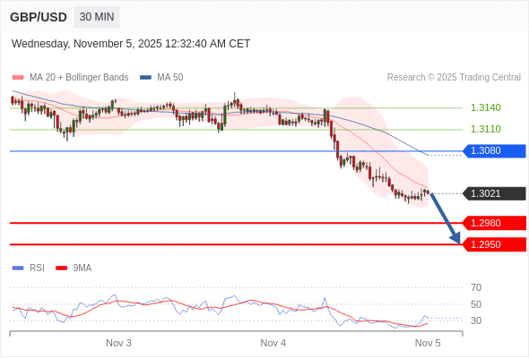 交易策略: 在 1.3080 之下,看跌,目标价位为 1.2980 ,然后为 1.2950 。