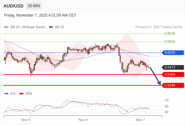 在 0.6500 之下,看跌,目标价位为 0.6460 ,然后为 0.6440 。