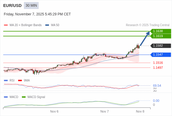 欧元/美元 当日内 : 看涨,当 1.1547 为支撑位。