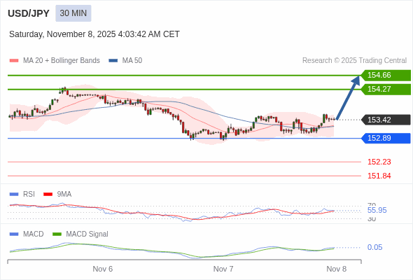 美元/日元 当日内 : 看涨,当 152.89 为支撑位。