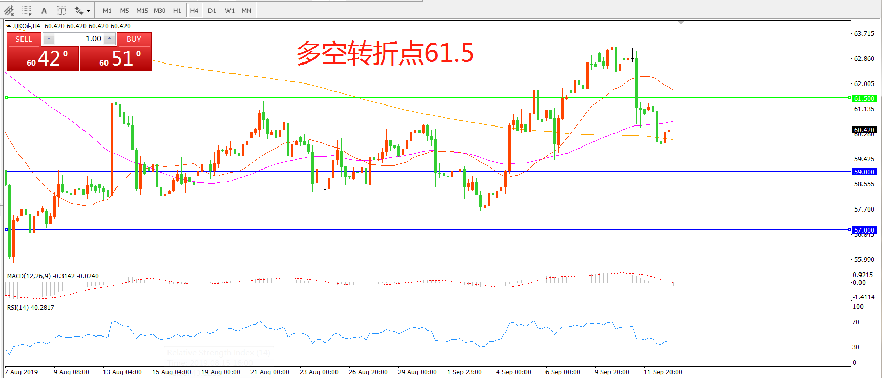 受到欧洲央行宽松举措以及中美贸易方面的消息的影响,金融市场短线剧烈波动, OPEC周四(9月12日)宣布同意要求伊拉克和尼日利亚达成减产来抑制原油供应,任何关于深度减产的正式决定都只能在12月的OPEC政策会议上做出,这令原油多头士气遭受抑制,布油震荡下行,最终收报60.42美元/桶。