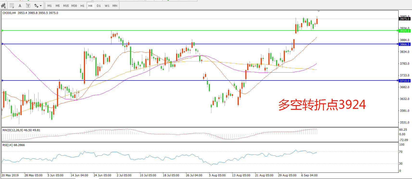 4小时图看,沪深300高开高走,3924支撑逐渐企稳,整体走势依然偏强,均线系统呈多头排列,MACD红柱增加,RSI指标走平,日内延续上行概率较大。