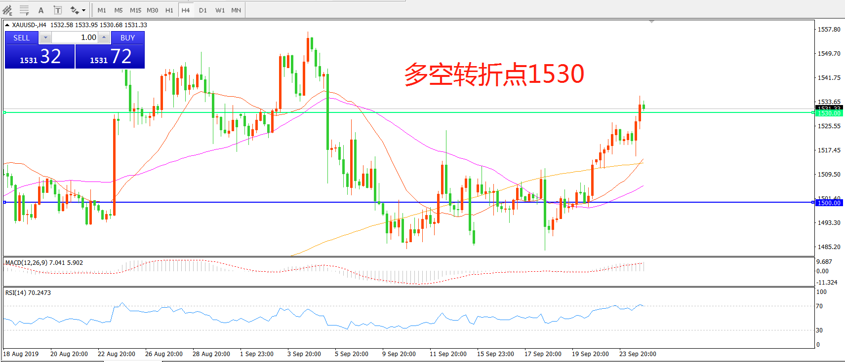 周二(9月24日)因对启动弹劾美国总统特朗普程序的呼声导致股市下跌,美国方面公布了市场关注的9月谘商会消费者信心指数,结果该数据表现大幅度差于预期现货金价短线跳涨4美元,最终收报1531.21美元/盎司。联合国第74届大会一般性辩论将于当地时间9月24日在纽约联合国总部拉开帷幕,各国元首届时会依次亮相,发表自己的观点,美国总统特朗普的言论,有可能会引发市场较大的行情。