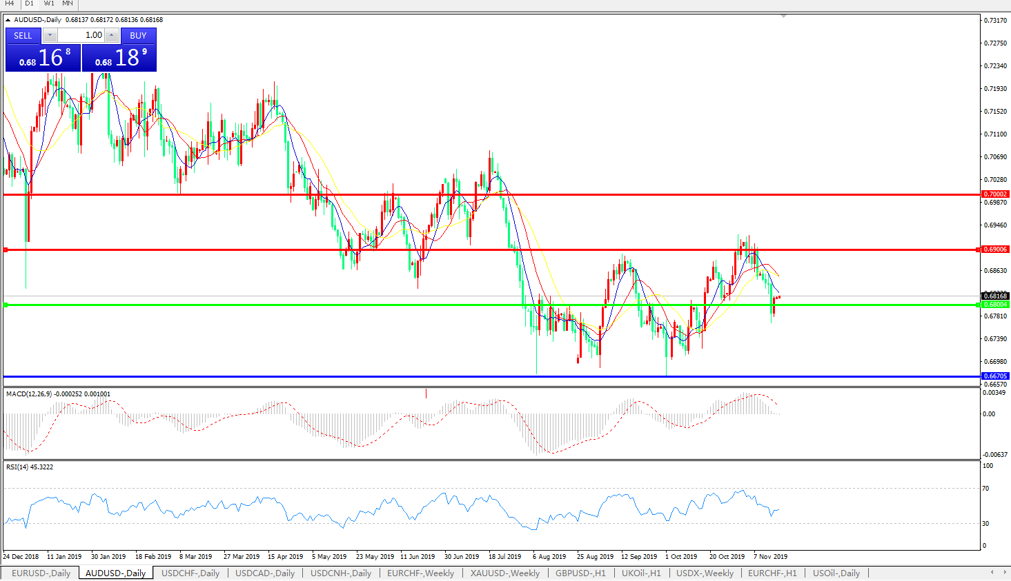 交易策略:0.6800上方看涨,目标0.6900、0.7000