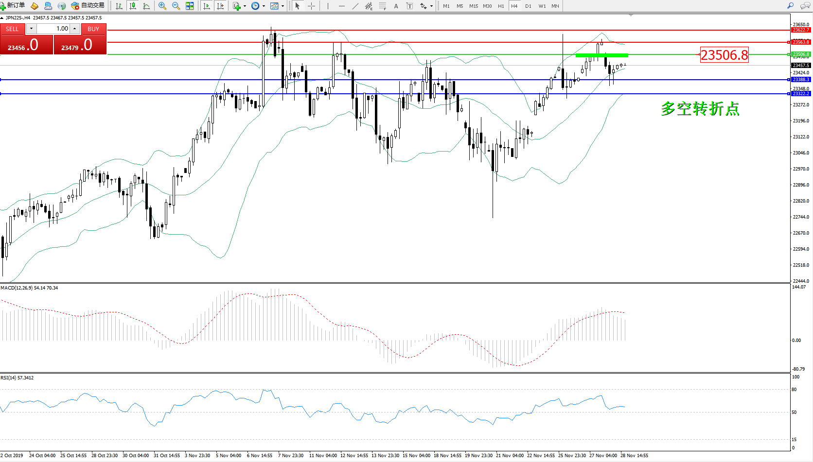 日经225指数11月28日(周四)收盘下跌35.27点,跌幅0.15%,报23402.50点。日本10月零售销售创逾四年半最大降幅,因上调消费税促使消费者削减支出,国内需求的力度亮起红灯。日本政府10月1日将消费税从8%上调至10%,希望借此解决该国庞大的公共债务负担。日本公共债务规模是国内生产总值(GDP)的两倍以上,债务负担是工业化国家中最重的;但一些分析师警告称,在面临出口和生产下滑的情况下,上调消费税可能导致经济失去增长动力。经济产业省周四公布的数据显示,日本10月零售销售较上年同期下降7.1%,受累于汽车和家电等大件商品以及服饰等需求疲弱。数据显示,百货店销售受挫尤其严重。这是自2015年3月下跌9.7%以来的最大跌幅,日本第三季经济增速为一年来最慢,10月出口创三年来最大降幅。经济黯淡状况激发对政府制定大规模支出计划的呼吁,以保持该国脆弱的经济复苏仍在正轨。一些分析师表示,受恶劣天气影响,10月零售销售状况尤其疲弱。当月日本中部和东部遭巨大台风袭击,加剧了消费税上调带来的负面影响。