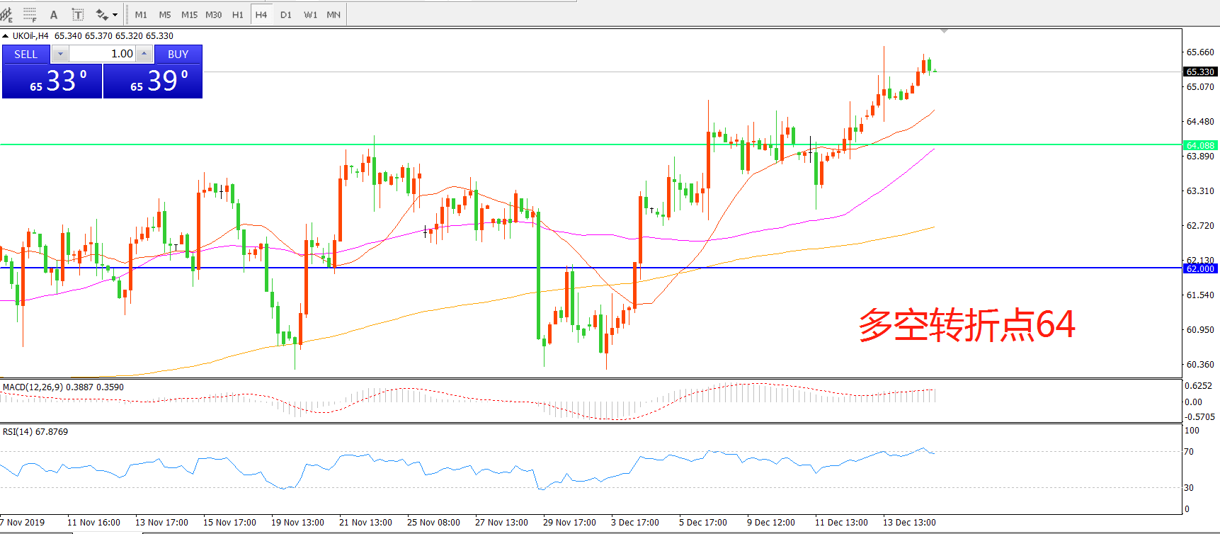 4小时图看,油价连续反弹,整体走势偏强,64美元被突破后,有加速上行的趋势,均线系统呈多头排列,MACD红柱增加,RSI指标走平,日内延续上行概率较大。