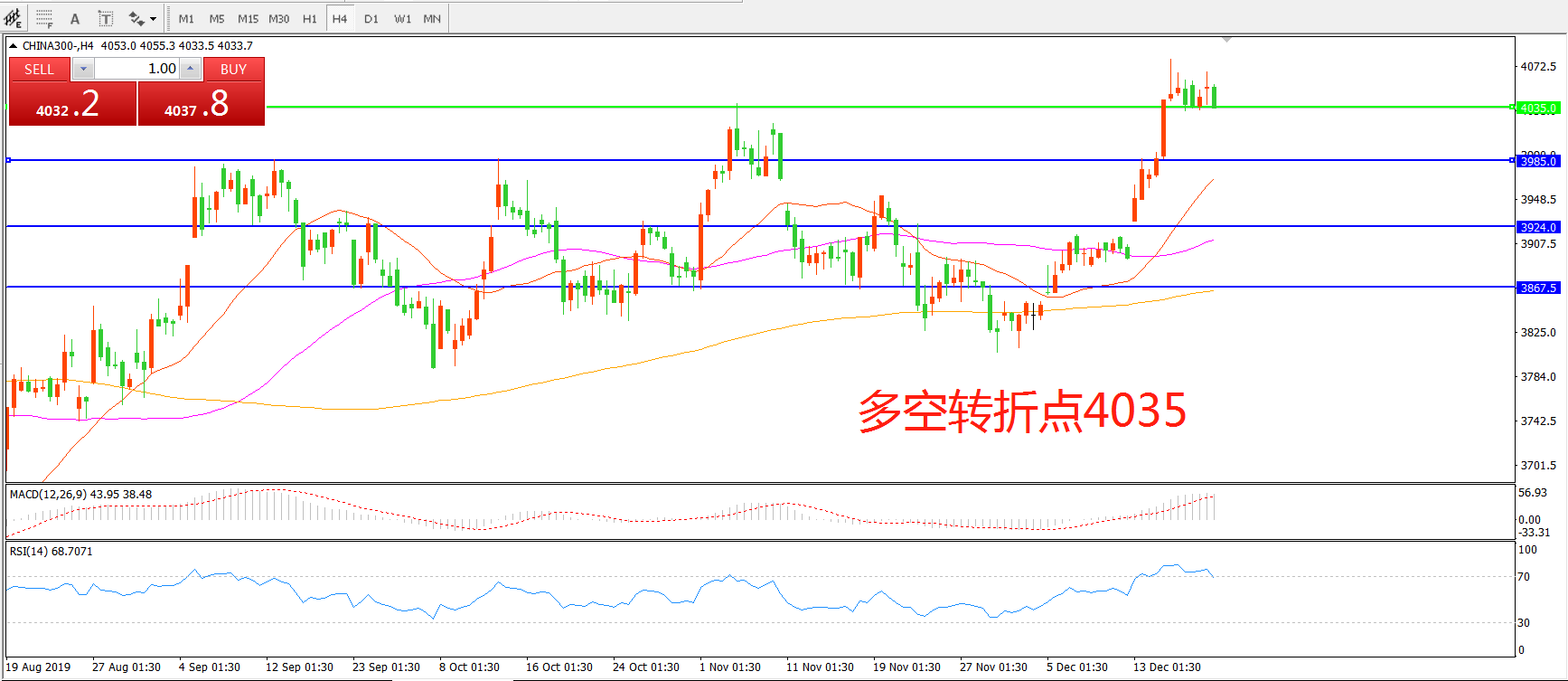 4小时图看,沪深300呈现冲高回落走势,4035附近存在短期阻力,但整体仍处于上行通道之中,均线系统走平,MACD红柱增加,RSI指标向下,日内延续上行概率较大。