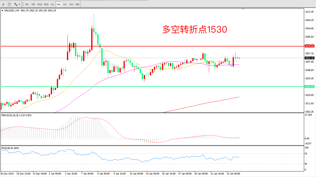 周四(1月24),继湖北武汉市“封城”后,黄冈、鄂州、赤壁、仙桃、潜江市发布通告,宣布不同程度停运城市公共交通。对冠状病毒的担忧导致避险情绪回升,黄金探底回升15美元1560美元/盎司附近。 同时,欧洲央行行长拉加德表示,需要长时间高度宽松的政策立场,宽松的货币环境对金价中期走势形成支撑。