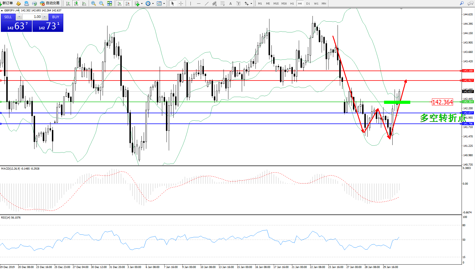 备选策略:142.364下方看跌,目标142.077、141.796