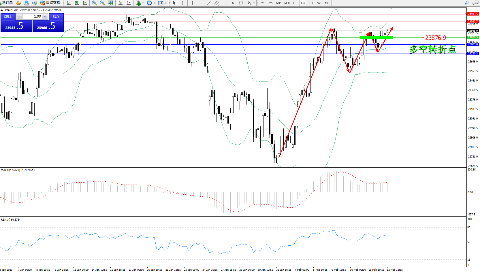 日经225指数2月12日(周三)收盘上涨173.52点,涨幅0.73%,报23859.50点。虽然日元1月份的机床订单数据不如人意,但是,日本政府在当前会考虑使用财政政策而不是货币政策来提振经济,日本央行再向下调整利率的空间十分有限,亚洲突发公共卫生事件的进展缓解了对全球经济影响的部分担忧,投资者选择风险较高的资产,亚洲股市再度纷纷走高。尽管股市人气乐观,但美国收益率仍在略高于近期低位的地方徘徊,日本出现贸易逆差时通常显现疲软迹象,相对其与美日利差的关系,其与日本贸易数据的关联度更高。