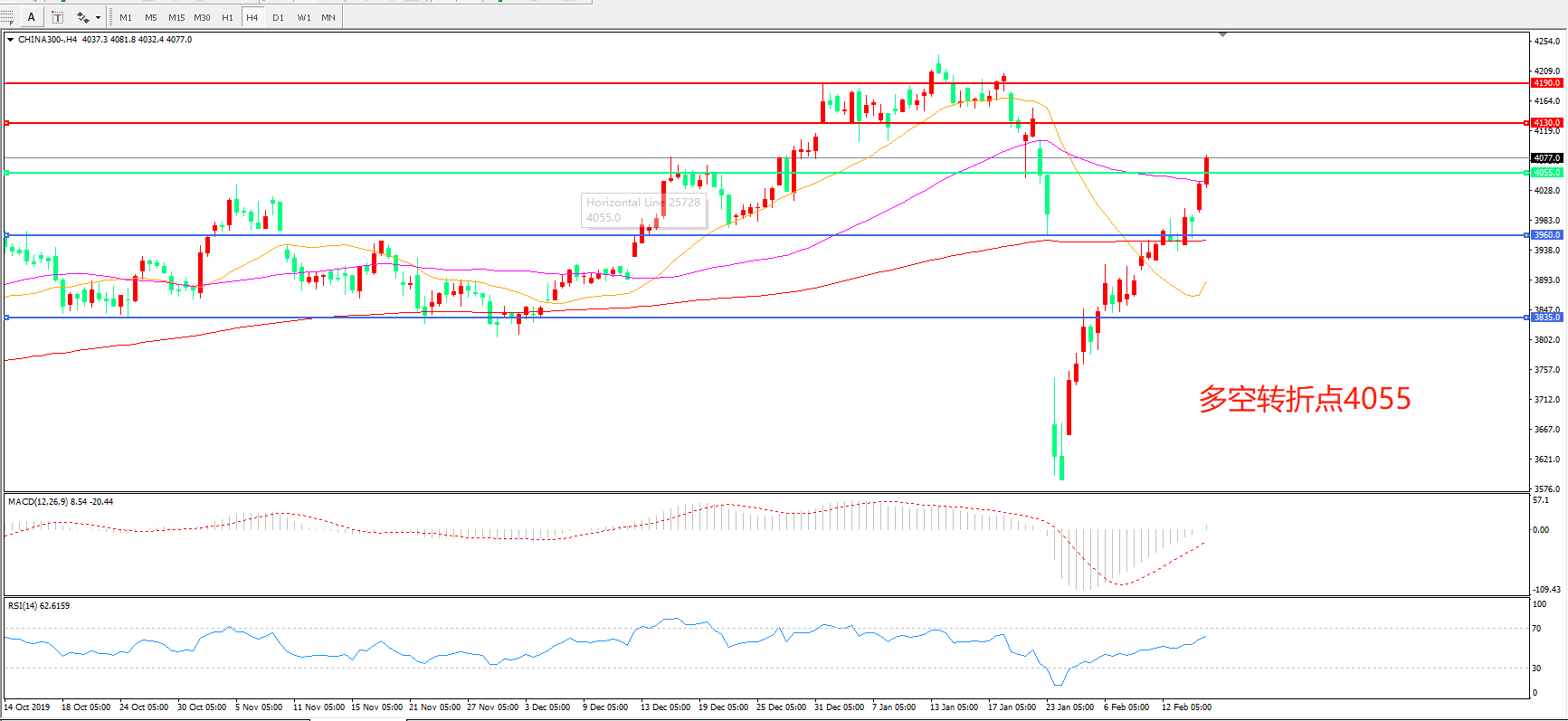 4小时图看,沪深300延续高位震荡,超跌反弹暂时告一段落,3960依然是短期多空分水岭,重点关注上方4055一线能否突破,均线系统走平,MACD绿柱缩短,RSI指标走平,近期延续上行概率较大。