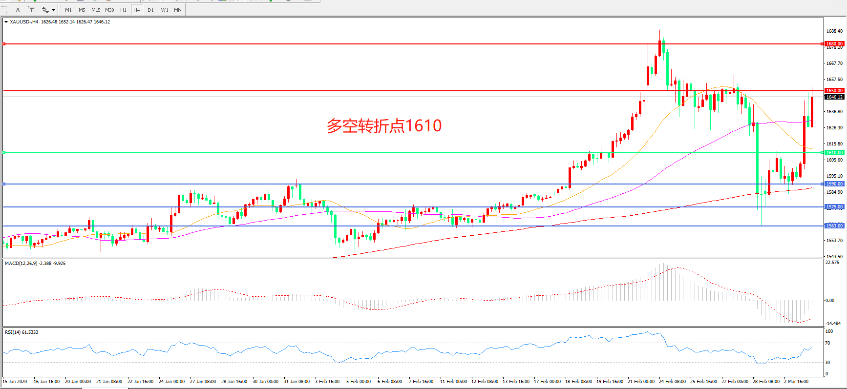 周二(3月3日) 23:00,美联储突然下调基准利率50基点,这是美联储自2008年以来的最大幅度降息,目的是为了对冲公共卫生事件构成不断变化的风险,消息公布后,美指大幅下挫,现货黄金拉升逾20美元,收报1646.55美元/盎司。