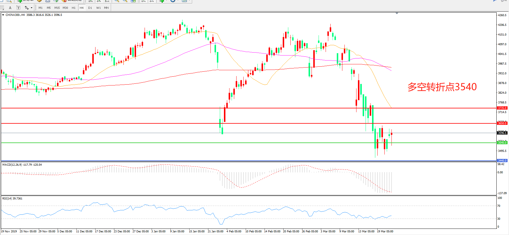 4小时图看,沪深300延续低位震荡,短期看有止跌迹象,但均线系统呈空头排列,MACD绿柱增加,RSI指标走平,日内延续震荡概率较大。