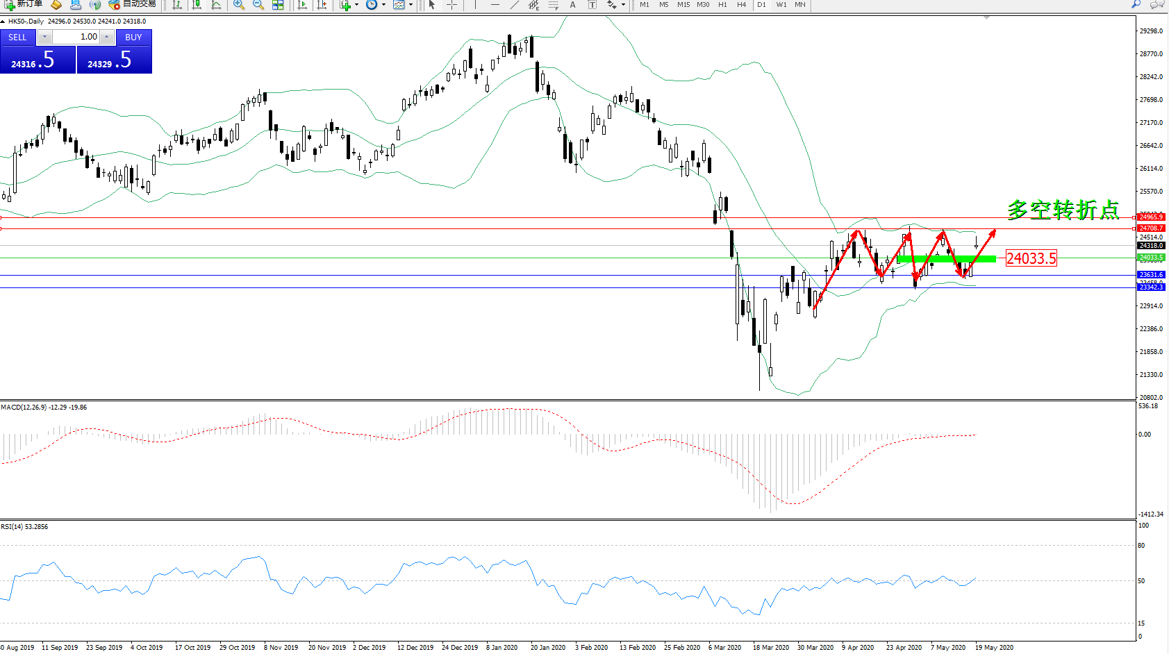 香港恒生指数519日(周二)收盘上涨453.36点,涨幅1.89%,报24388.13点;港股市场主要指数均大涨,三大指数全日维持高位震荡。航空股全线大涨,中芯国际升超7%,三大航空股均涨超4%;手机概念股、汽车股、石油股纷纷上涨,恒指国指成份股集体上涨,中国太平大涨超5%领衔走高;华彩控股午后获资金追捧,暴涨超100%。隔夜美国市场方面,冠状病毒疫苗研发取得进展和美联储主席讲话提振了市场乐观情绪。特朗普再次敦促美国重启经济。美国更多地区重新开放。欧洲多个国家宣布将解除申根地区旅行限制,加强了市场对发达经济体解封的期待。