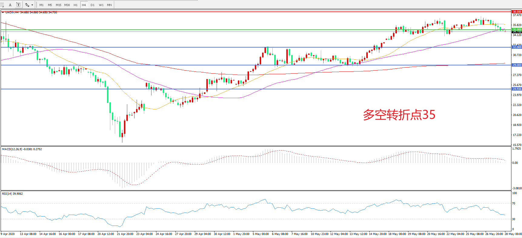 4小时图看,油价震荡下行,整体走势表现疲软,35美元成为短期多空分水岭,均线系统走平,MACD红柱减少,RSI指标向下,日内延续震荡概率较大。