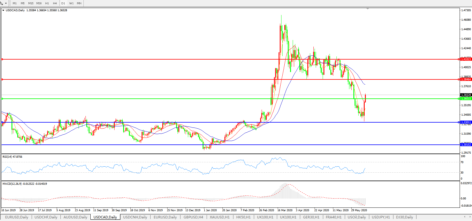 周四(6月11日)欧洲时段,美元兑加元刷新近四个交易日高位至1.3509,日内涨幅达到0.75%,因国际油价暴跌,NYMEX原油价格重挫近8%,布伦特原油价格也暴跌逾6.6%;尽管OPEC和俄罗斯等非OPEC产油国已经同意,将970万桶/日的减产协议延长一个月至7月底,但俄罗斯不希望油价上涨吸引美国页岩油产业重回市场参与竞争,这意味着减产可能不会延续更长时间,油价上涨压力面临终结;在最近的逾两周时间里,随着美元指数单边走弱,包括加元在内的主要非美货币受到不同程度利好,因此汇价技术上也存在调整需求;但需要指出的是,即便在新冠疫情爆发之前,加拿大家庭债务水平已大幅高企。新冠疫情导致的失业率上升将使得家庭面临更大的财务压力,预计家庭债务水平会进一步增加;加拿大失业率从疫情爆发前略高于5%的水平升至目前的逾13%,这是自1982年以来的最高失业率;家庭债务水平高企以及产油国继续延长减产协议的前景不明朗,将给加元带来进一步的下行压力。