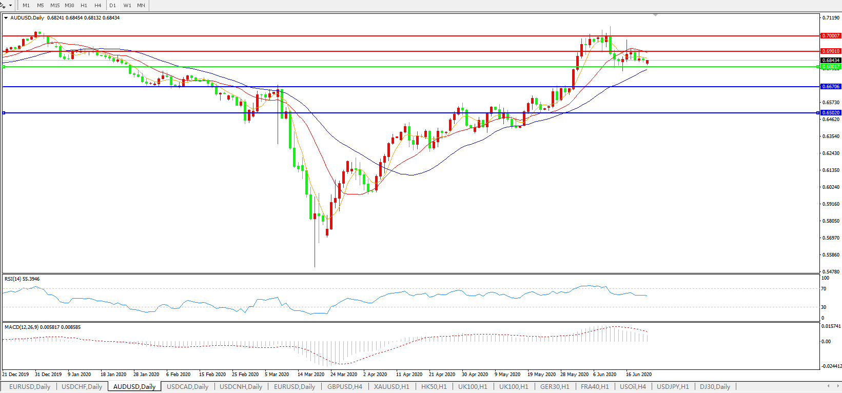 交易策略:0.6800上方看涨,目标0.6900、0.7000