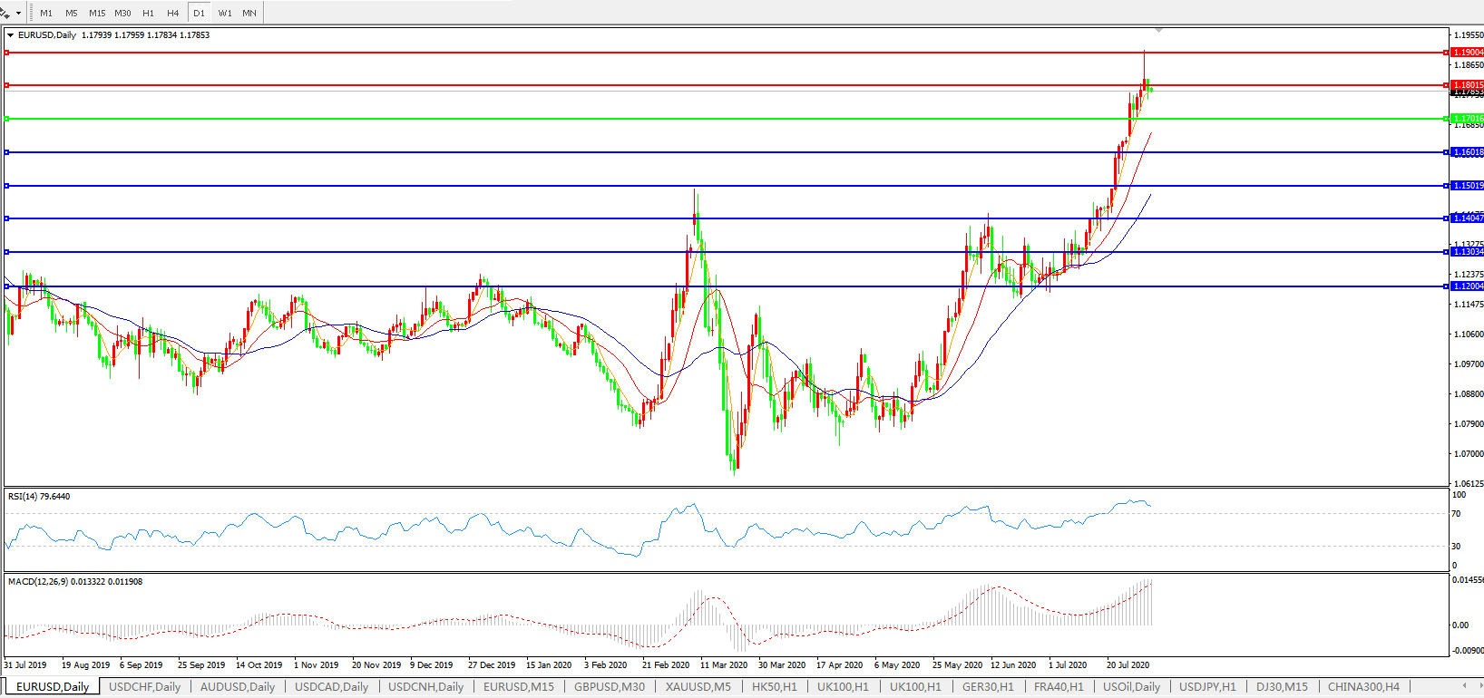 欧元兑美元下跌0.58%至1.1778,跌破1.18时触发止损;数据显示欧元区经济在第二季录得有记录以来最严重萎缩,7月欧元区通胀意外攀升,欧元几乎未受此影响。欧元5月时还曾跌破1.10美元,但在欧盟领导人本月同意通过共同举债筹资设立7500亿欧元经济复苏基金后,给区域合作带来重大提振,许多投资者再度青睐欧元。欧元贸易加权汇率处于2014年以来的最高水平。欧元兑美元月涨幅达到4.84%,从而成为约十年来表现最好的一个月。对AT&T将偿还8月3日到期的22亿欧元债务的预期,可能对欧元构成一些临时支撑,本周早些时候,该公司宣布了110亿美元的债务回购计划。欧元兑日元触及125.21日元的年内新高。