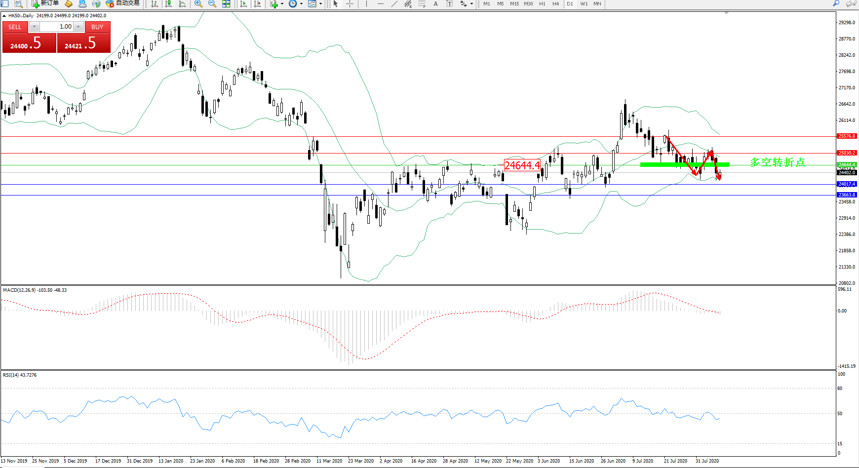 香港恒生指数8月10日(周一)收盘下跌154.19点,跌幅0.63%,报24377.43点;港股三大指数震荡收跌,恒指盘中一度翻红,尾盘再度回落,据央视,澳门特区政府社会文化司司长欧阳瑜在10日下午举行的发布会上透露,自8月12日起,恢复办理珠海市民、珠海居住证持有人赴澳门旅行签注,包括个人游及团队游。澳门恢复通关指日可待,濠赌股逆势大涨,银河娱乐涨5.5%;香港疫情增长趋缓,香港本地消费股走强;金价回落,黄金股跌幅明显;苹果概念股集体走弱,苹果或下架微信App 对iPhone出货量影响大,腾讯大跌近5%拖累恒指下挫140点。壹传媒收涨183.33%,创始人黎智英及多名高层被港警拘捕。今日南下资金逆势净流入40.54亿港元,大市成交额为1352亿港元。香港特区政府卫生署卫生防护中心传染病处主任张竹君称,截至今天凌晨0时,香港新增69例新冠肺炎确诊病例,连续8日新增确诊病例数低于百例。其中,有2例为输入性病例,67例为本地确诊病例。累计确诊病例已达4149例,包括一例疑似病例。本地确诊病例中,有45例与之前的确诊病例相关,有22例源头不明。