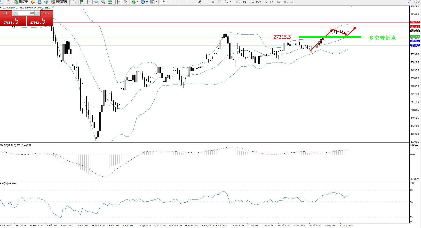 交易策略:27315上方看涨,目标28212、28627
