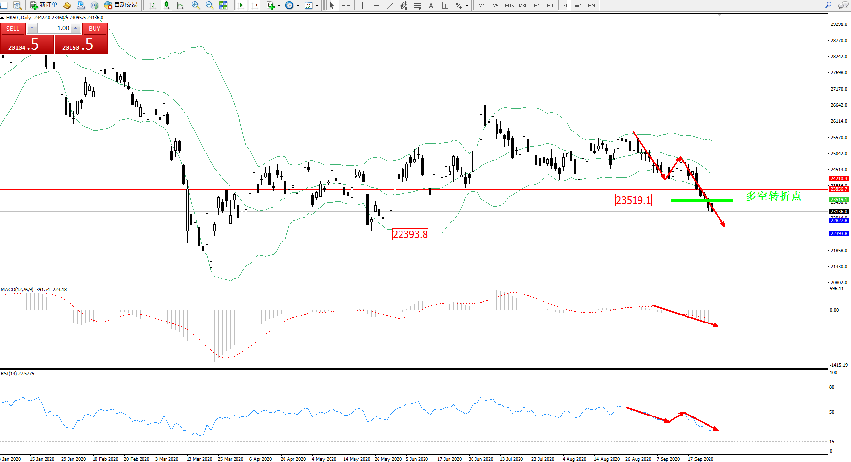 技术点评:空头动力处于布林带指标通道下轨持续震荡不断下移中,空头动力下破下轨后有继续下行态势,跌势未有止步迹象,前期低位22393位置近在咫尺,破位在即,布林带指标呈缓慢张口走势持续向下移动中,MACD指标处于0轴线下方空头区域维持弱势窄幅整理平缓慢向下移动中,RSI指标处于50均衡线下方空头区域维持震荡下行中;