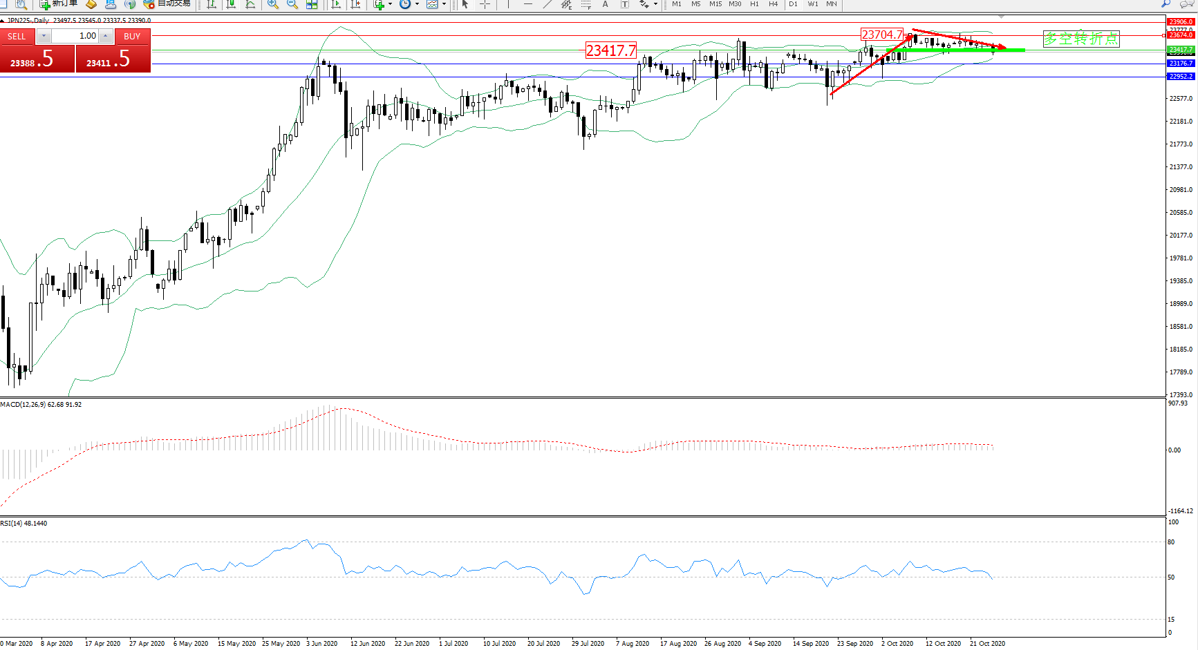 日经225指数10月26日(周一)收盘下跌30.09点,跌幅0.13%,报23486.50点。日本央行周四料将保持货币政策不变,并暗示准备好延长危机应对方案的期限,该方案已成为其应对新冠危机的主要工具。消息人士称,虽然日本央行料将略微调降本财年经济和物价预测,但鉴于认为日本经济将温和复苏的观点,许多委员认为没有立即扩大刺激的必要。预计日本央行行长黑田东彦将在记者会上重申,如有必要,日本央行准备延长一揽子援助措施的截止日期。另一位消息人士指出,延长截止日期几乎是肯定的,问题在于何时延长,相关决定很可能在明年1月做出,以便给金融机构足够的时间做好准备。