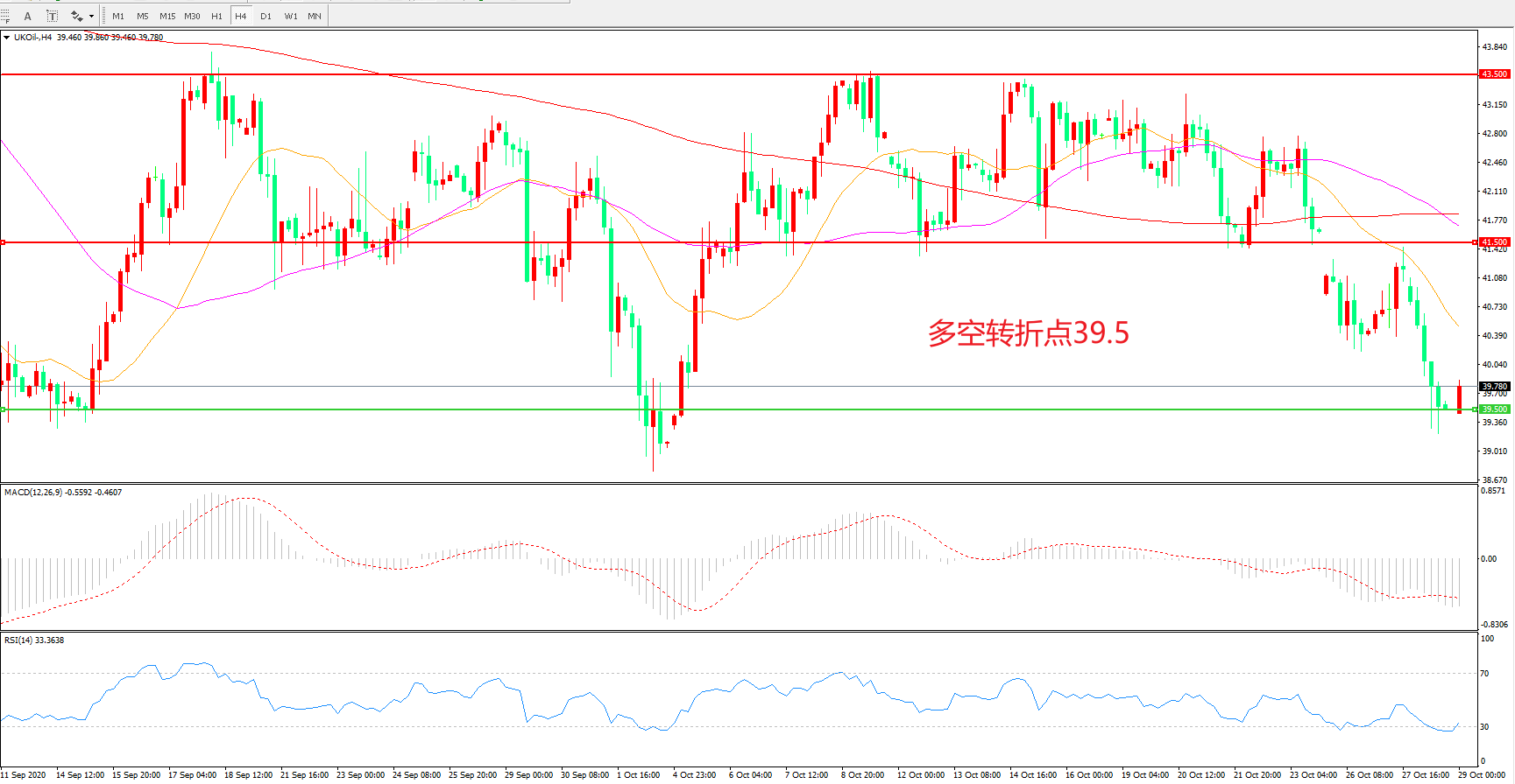 4小时图看,油价长阴连续下破,短期表现异常低迷,短期均线拐头向下,MACD绿柱增加,日内延续下行概率较大。