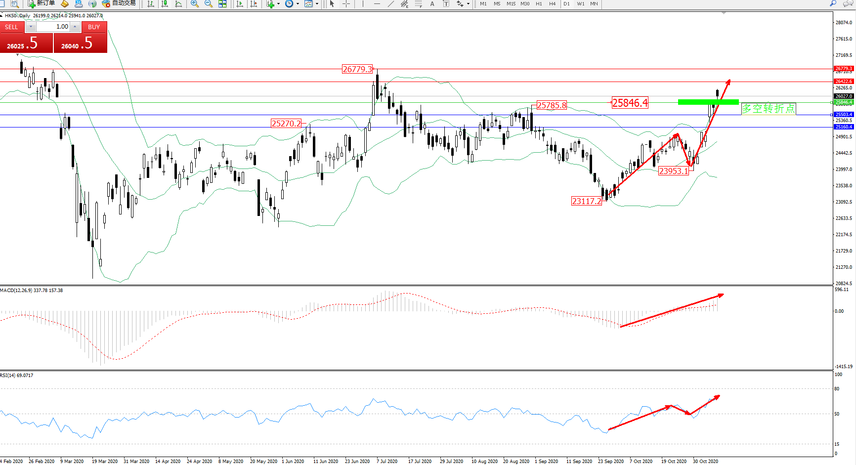 技术点评:多头动力延续布林带指标通道上轨附近持续震荡拉升上扬态势良好,后续拉升上行动力强劲,前期高位26779附近节点近在咫尺破位在即,布林带指标呈张口走势持续中,MACD指标处于多头动力高位持续震荡上扬走势良好,RSI指标处于多头区域持续震荡上行中;