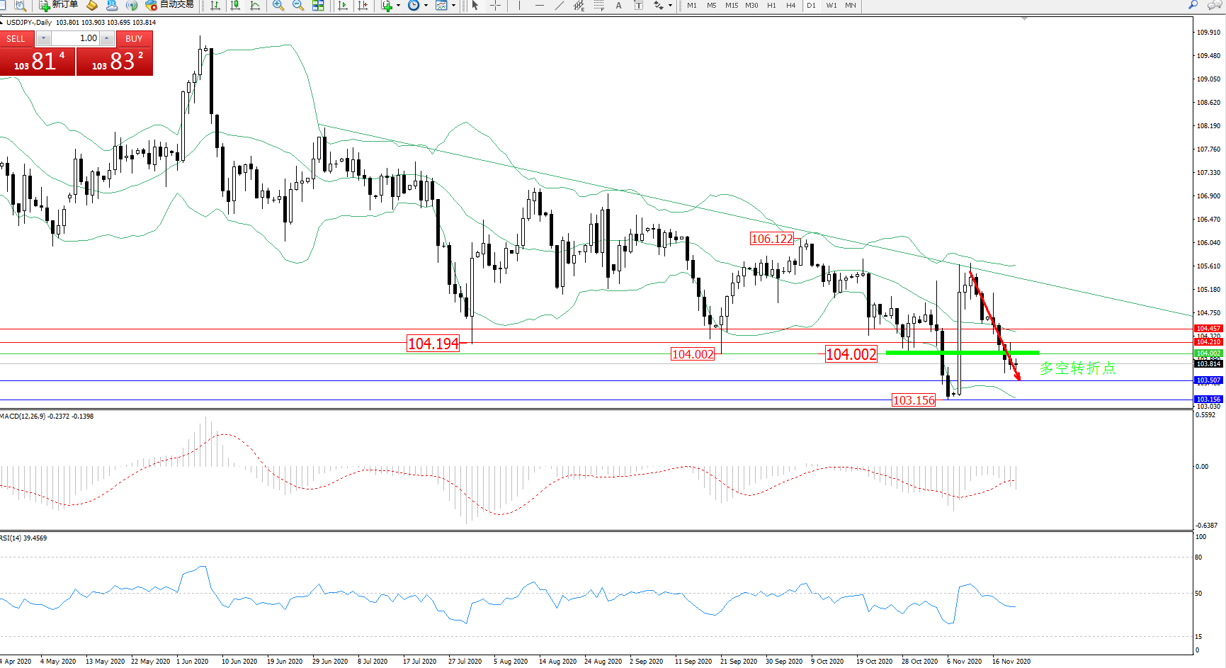 技术点评:低位多头动力趋势拉升上扬后,高位即将触及布林带指标上轨附近出现反转震荡下行走势,跌势未有止步迹象,空头动力强劲,布林带指标呈收口平移走势持续中,且有继续向下移动态势,前期低位103.156位置近在咫尺,MACD指标处于空头区域低位震荡回升后开始反转下行中,RSI指标处于50均衡线下方弱势整理后开始下行中;