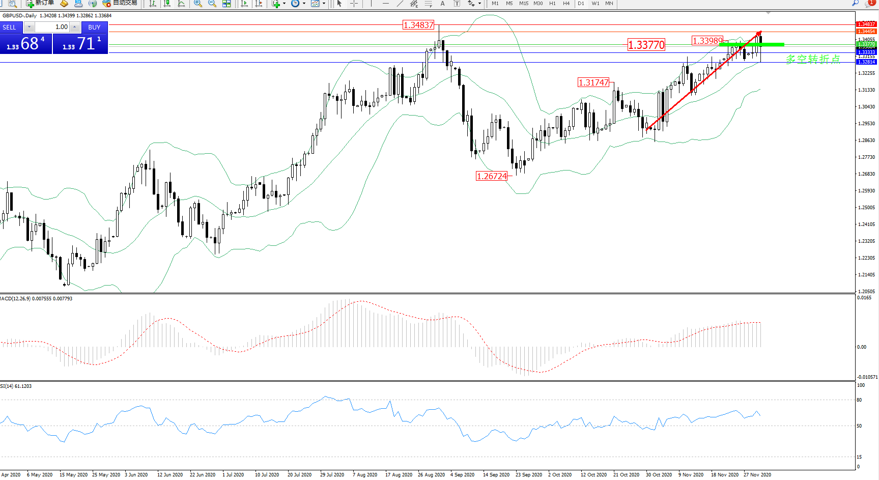 技术点评:多头动力延续布林带指标中上轨区间持续震荡向上移动态势良好,多头动力屡破新高,前期高位1.34837位置近在咫尺破位在即,高位出现短暂回撤至中轨附近后得到支撑快速回撤升,布林带指标上行趋势走势持续中,MACD指标处于多头区域持续震荡上扬后开始有平移迹象,RSI指标处于多头区域维持整理后有继续上扬迹象;