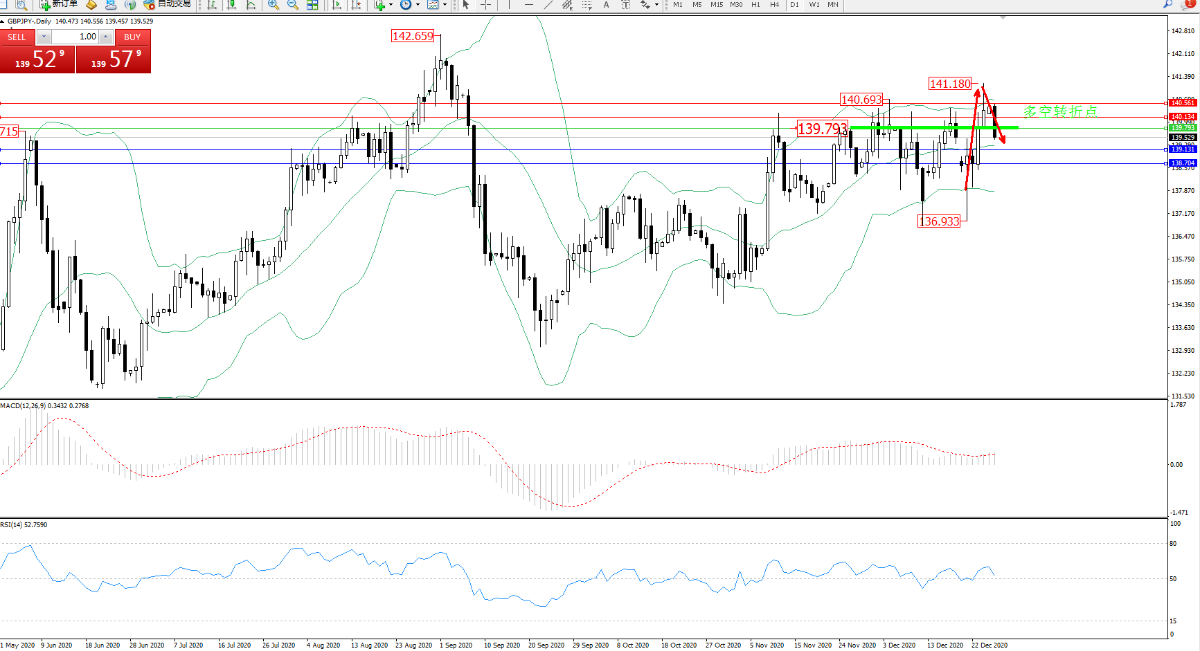 技术点评:长时间维持在布林带指标通道内宽幅震荡平移中,高位抵达141.180位置后出现回撤下行,多头动力有明显上行遇阻后出现下行,布林带指标呈持续平移走势,MACD指标处于多头区域维持窄幅整理平移,RSI指标处于多头区域维持震荡平移后有下移迹象;