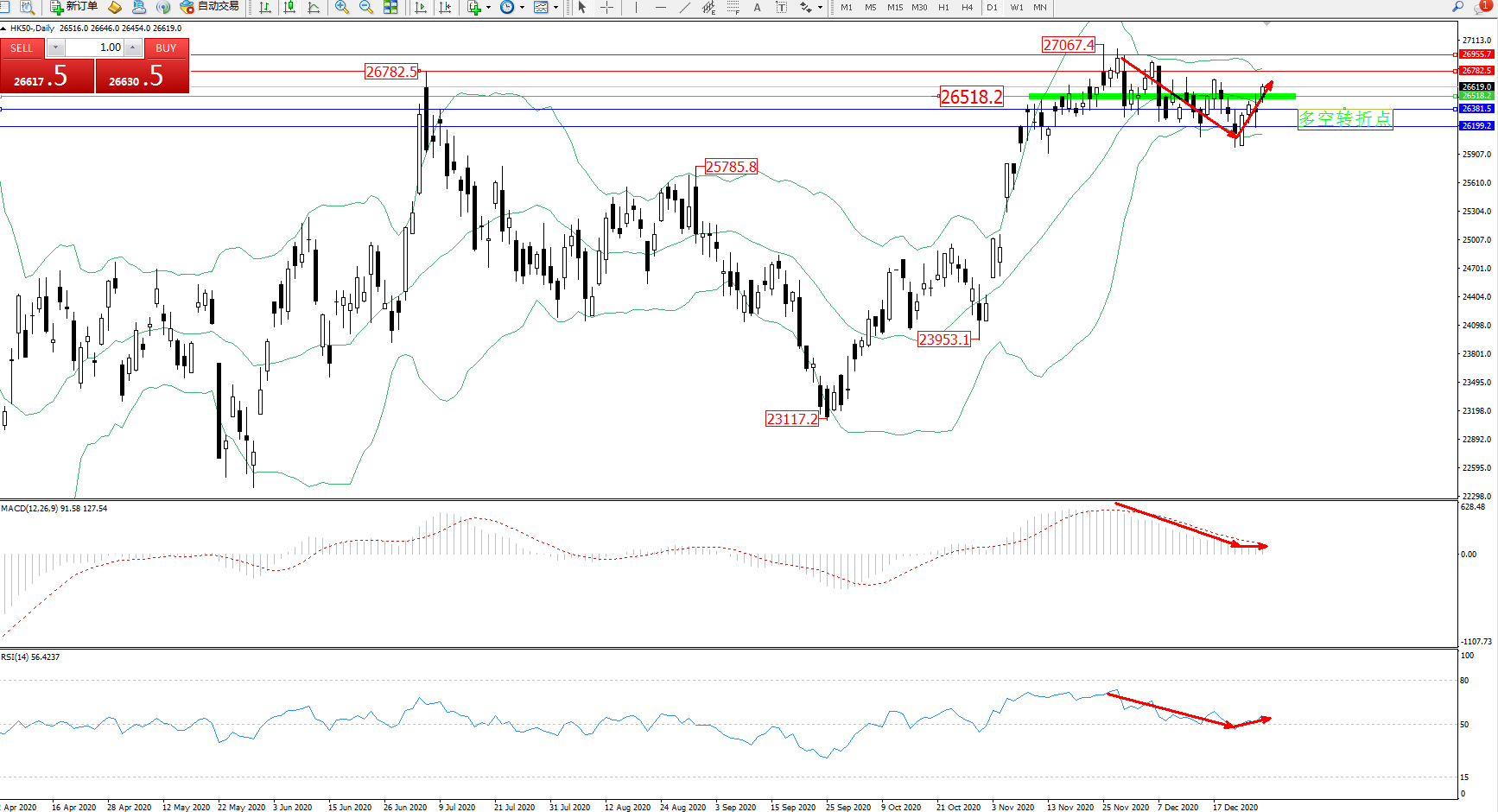 香港恒生指数12月29日(周二)收盘上涨253.86点,涨幅0.96%,报26568.49点;港股主要指数全天高位震荡,恒生科技指数收涨2.59%,科技股依旧是市场焦点,昨日科技股全线重挫,今日又集体反弹上涨,带领大市向好,大型科技股中,腾讯涨2.22%,阿里巴巴涨5.71%,美团涨5.15%,京东涨1.13%,小米涨5.3%。今日南下资金净流入77.11亿港元,大市成交额为1388.2亿港元。据央视,香港特区政府卫生署卫生防护中心29日公布,截至29日零时零分,香港新增新冠肺炎确诊病例53例,其中50例为本地感染病例,14例源头不明,累计确诊8725例。市场已对2021年复苏有相当憧憬,这从几个周期性指标可见一斑,通胀预期亦随经济复苏的预期回升,尤其是在环球主要央行之积极货币宽松政策支持下。新冠疫苗有机会面世、环球及中国经济复苏、财政刺激及极低利率等持续对资产价格构成支持,但MSCI香港指数自三季度至今反弹逾10%,已经体现不少利多因素,估值水平不算吸引。