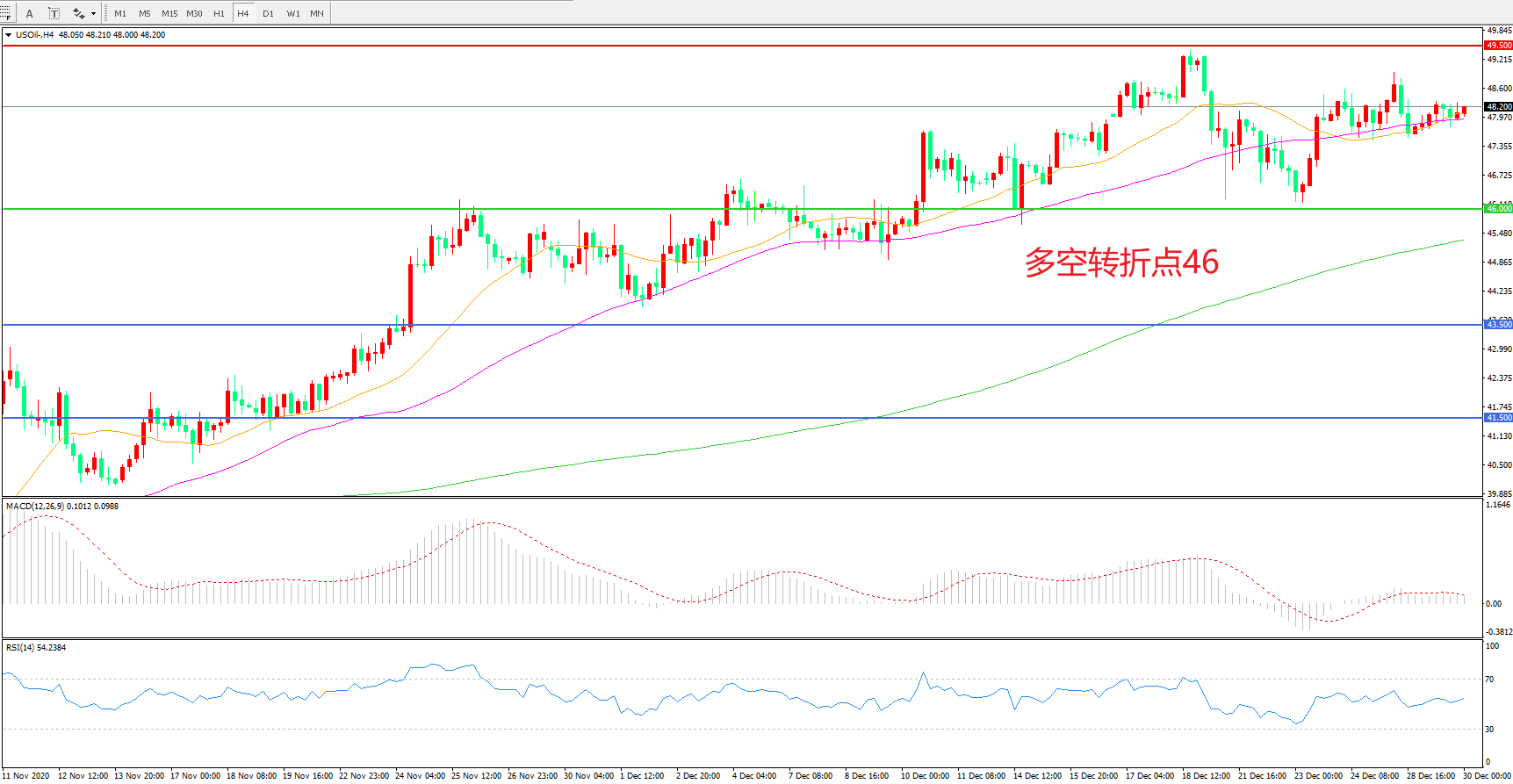 周二(12月29日),市场对经济复苏带来的用油需求保持乐观,风险情绪回暖,但新冠疫情发展和OPEC+增产政策仍可能制约油价反弹,多空双方博弈加剧,美国WTI原油延续高位震荡,收报48.11美元/桶。就目前的市场而言,利多和利空的因素都处于酝酿阶段,因此短期内市场仍处于相对混沌的表现。