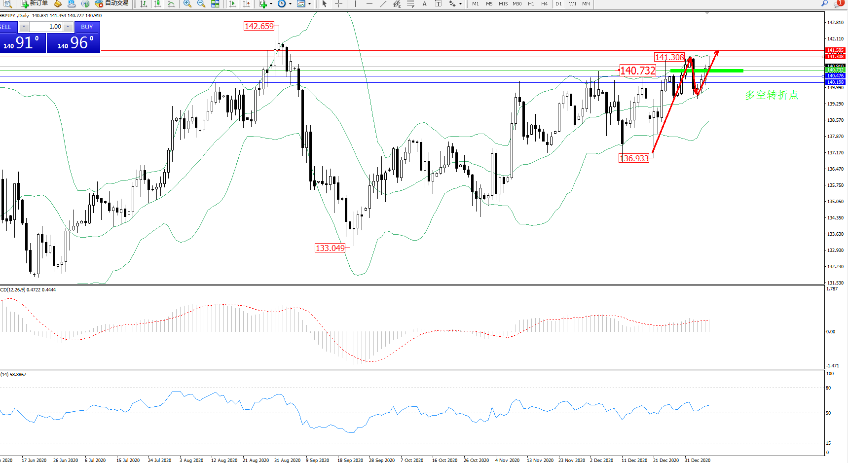 技术点评:多头动力延续布林带指标通道内中上轨区间持续震荡上扬中,高位已然长时间维持持续整理,多头动力有继续上扬态势,前期高位141.308位置短期或将有破位迹象,布林带指标呈收口走势后有上移态势,MACD指标处于0轴线上方多头区域维持整理平移中,RSI指标处于50均衡线上方持续徘徊后有继续向上移动迹象;