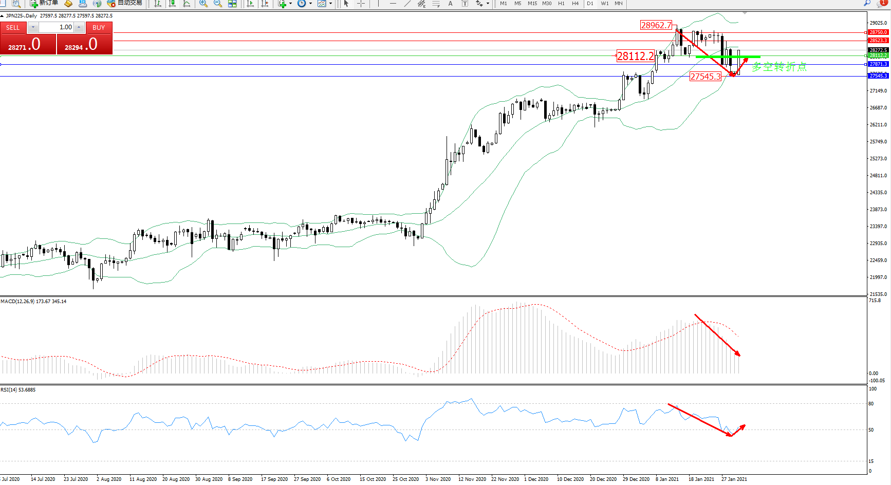 日经225指数2月1日(周一)收盘上涨415.61点,涨幅1.50%,报28079.00点。据日本共同网:日本政府相关人士透露,日本拟2日决定延长紧急事态宣言。日本的数字化努力对各个行业的信贷影响将是好坏参半的。芯片短缺给汽车制造业带来的影响正在加剧。据日本媒体报道,本田2月上旬位于日本国内的一家主力工厂将停工5天,马自达在全球的多家工厂下个月也将减产。另外,丰田、日产和斯巴鲁近期也都出现了减产的情况。截至目前,至少已有5家日本车企受芯片短缺影响,减少了汽车产量。日本三菱日联摩根士丹利证券公司最近发布报告称,预计芯片荒将导致日本车企减产约50万辆,占到全球减产总量的1/3。
