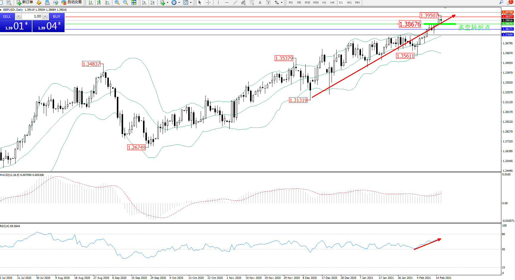 交易策略:1.38676上方看涨,目标1.39377、1.39798