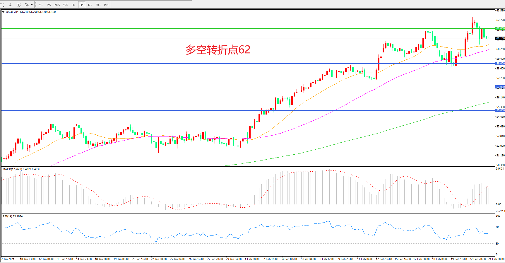 4小时图看,油价回突破前期整理区间后小幅回落,整体表现依然较强,62美元成为短期阻力,均线系统形成下方支撑,MACD红柱减少,RSI指标走平,日内震荡上行概率较大。