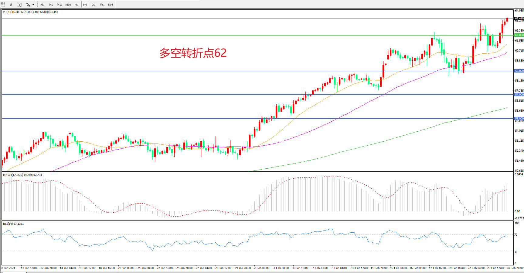 周三(2月24日),在OPEC+3月会议即将召开之际,市场对于油市的乐观情绪继续蔓延,WTI原油延续强势表现,大幅拉升后收报63.33美元/桶。随着美国得州的交通逐渐恢复正常,供应端趋紧和需求恢复都有助于短期内提升油价,但需要注意的是,年初以来国际油价已飙涨超26%,获利回吐可能会使油价经历小幅回调。